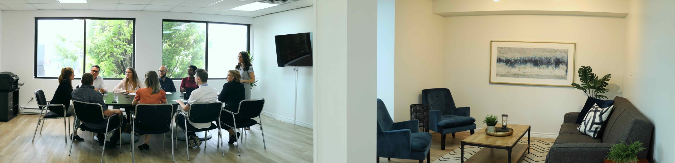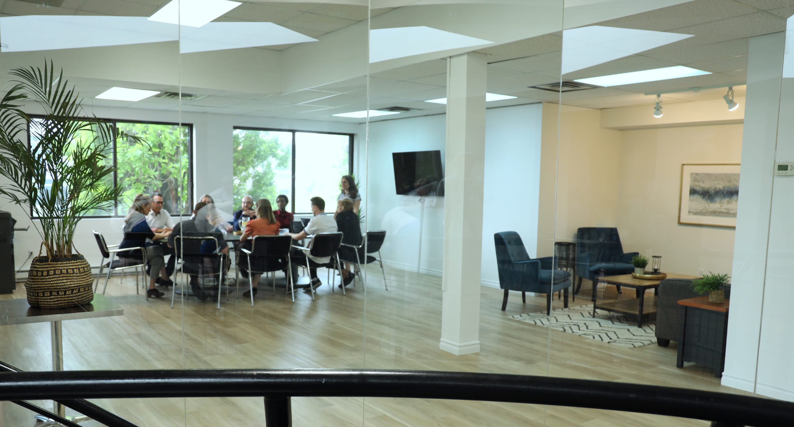 Le rez-de-chaussée, avec ses grandes fenêtres, laisse entrer beaucoup de lumière naturelle. Un hall d’entrée spacieux et élégant ainsi qu’un espace style café sont disponible pour que vos invités puissent se détendre ou prendre un verre pendant les pauses ou les transitions.